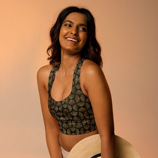 Black And Gold Art Deco Flower Reflections Longline Sports Bra