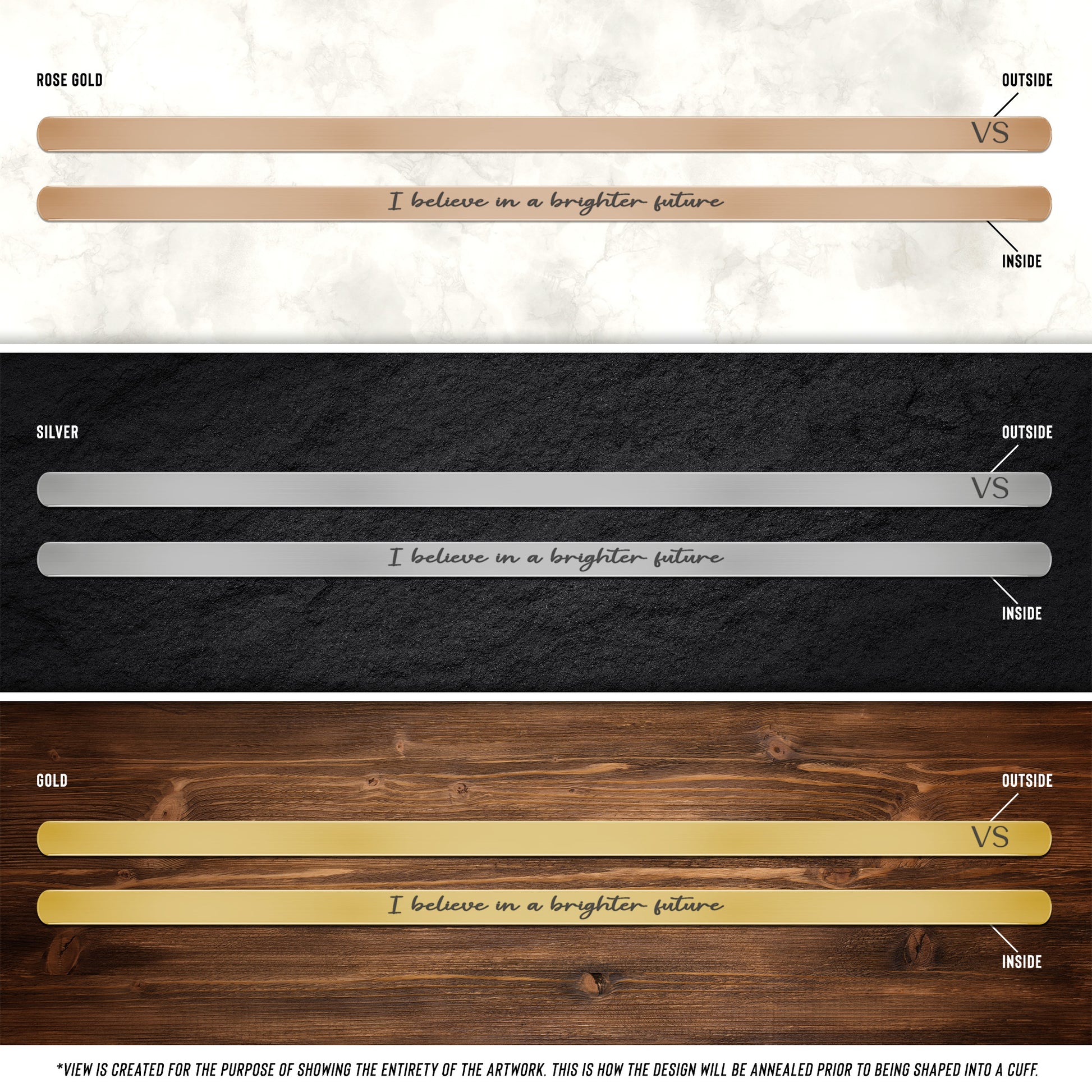 Believe in a brighter future with this stunning cuff bracelet. Crafted from premium stainless steel and elegantly plated in 18K Gold, Rose Gold, or Silver, it is a shining symbol of your optimism. A meaningful and beautiful way to express your faith in a better tomorrow.