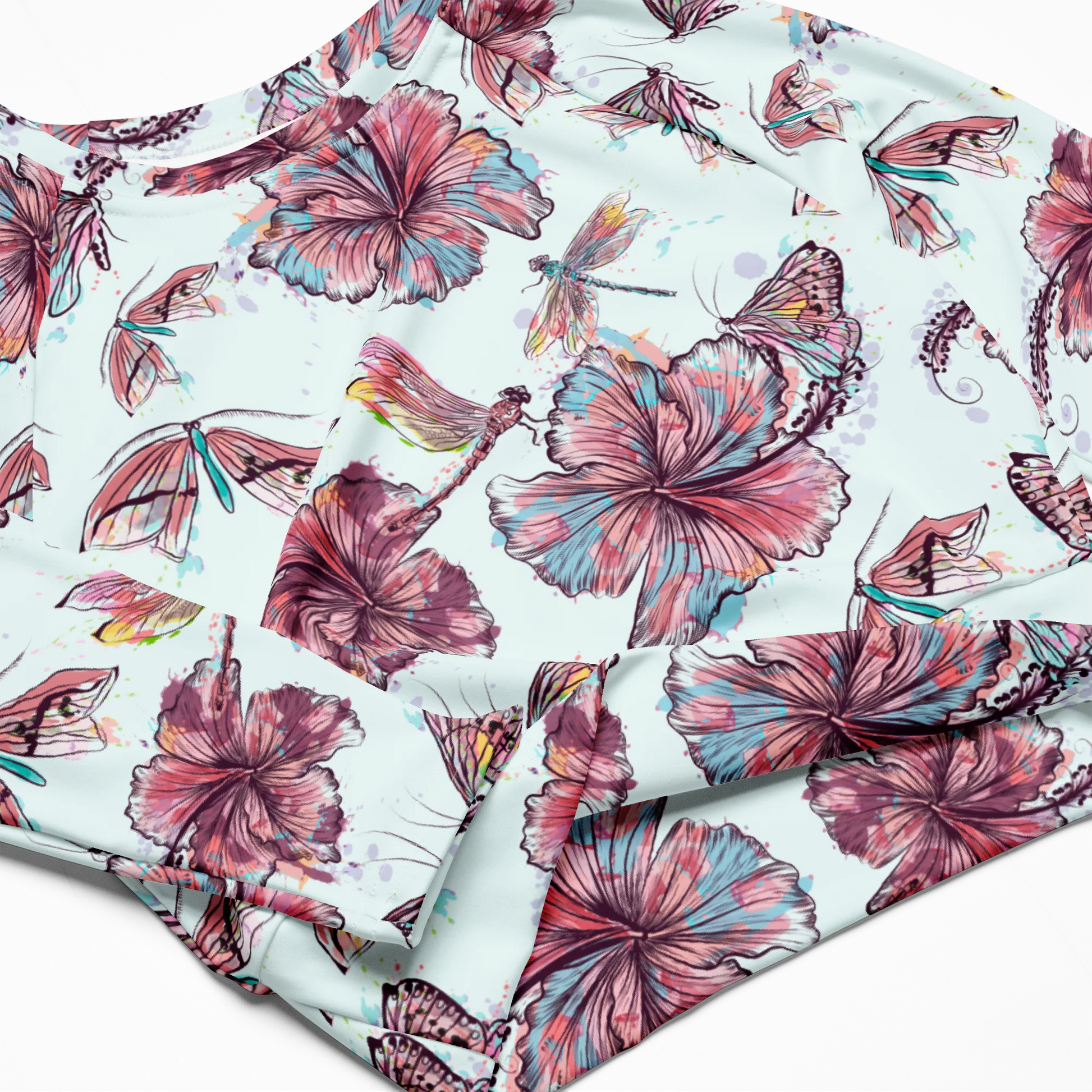 This stylish crop top features an intricate hibiscus pattern for a sophisticated look. Crafted from recycled materials, it enhances your style and supports eco-friendly practices. Make a statement while staying mindful of the planet.